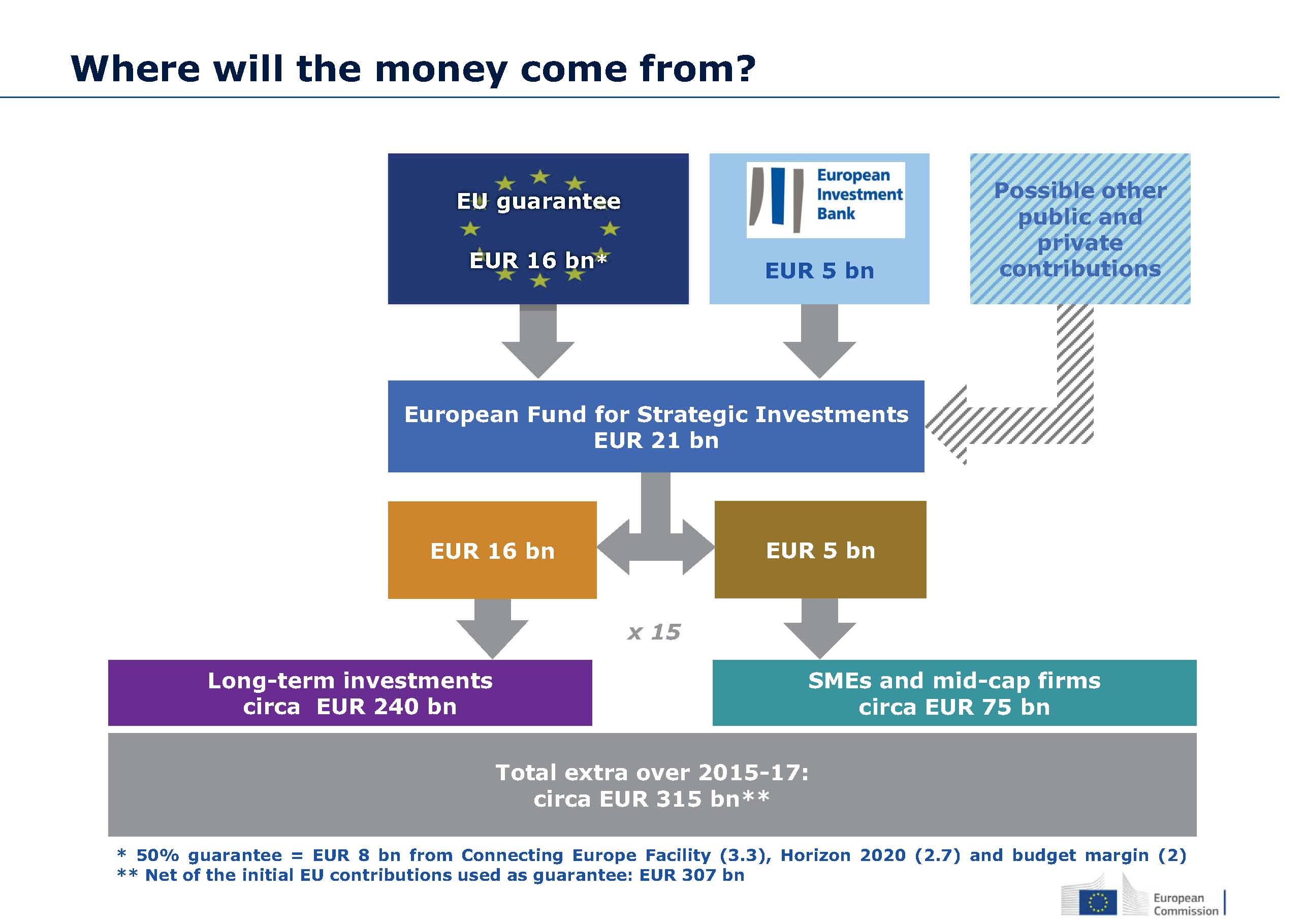 Dalį lėšų naujasis fondas perims iš programos "Horizontas 2020" (ji skirta remti mokslinius tyrimus ir inovacijas) bei Europos infrastruktūros tinklų priemonės. Vis dėlto europarlamentrai užtikrino, kad esamų programų apkarpymai būtų mažesni vienu milijardu eurų, o ši suma būtų skirta iš nepanaudotų 2014 ir 2015 m. ES biudžeto lėšų.