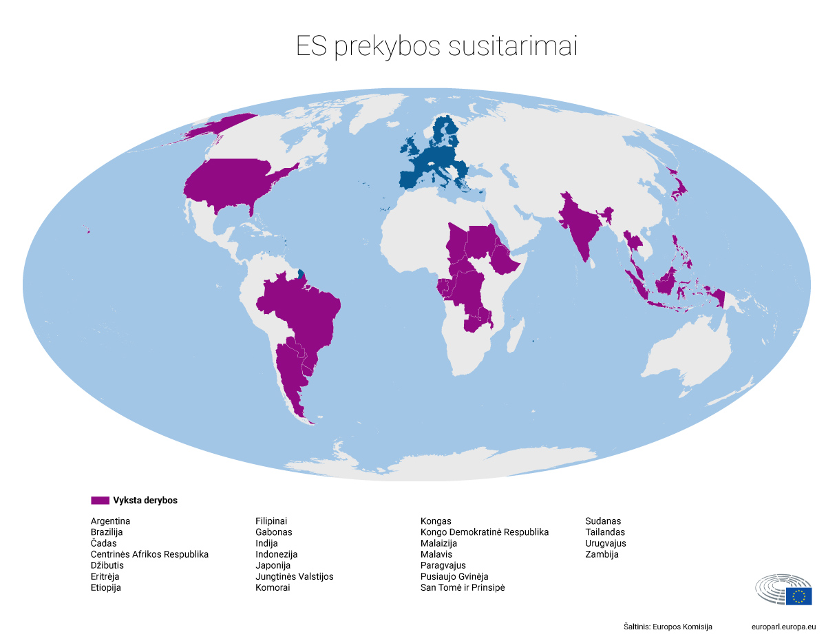 Tam, kad ES prekybos susitarimai įsigaliotų, jiems turi pritarti Europos Parlamentas. Tačiau sutartis su Kanada anaiptol ne vienintelis susitarimas, laukiantis patvirtinimo. Žemiau skaitykite apie tai, kokius susitarimus Sąjunga suderėjusi, kokie jau galioja ir dėl kokių šiuo metu deramasi.